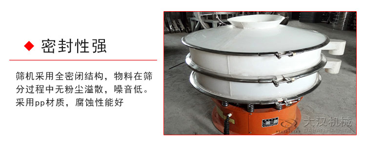 塑料震動篩采用聚丙烯材料,所以也叫做聚丙烯震動篩,是通過特殊的加工工藝制作的,非常適合篩分有酸堿性、腐蝕性的物料,從篩框、篩網(wǎng)和清網(wǎng)裝置完全采用非金屬材料,可以有效防止物料在篩分過程中和金屬接觸發(fā)生反應(yīng)。
