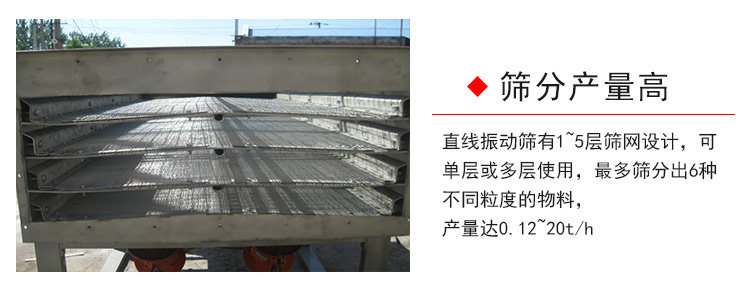 直線振動篩有1~5層篩網(wǎng)設(shè)計,可單層或多層使用,多篩分出6種不同粒度的物料,產(chǎn)量達0.12~20t/h。